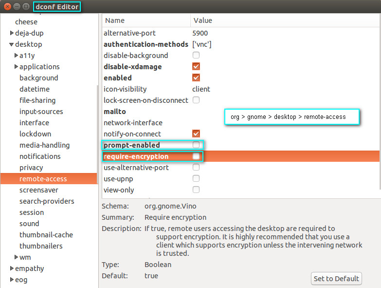 2、需要通過Dconf-editor調(diào)整,打開終端(快捷鍵:Ctrl+Alt+T)輸入命令:dconf-editor 開啟,然后訪問如下配置路徑 org > gnome > desktop > remote-access;