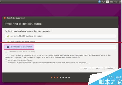 3、此處我們需要注意的是:在安裝Ubuntu桌面系統期間,最好斷開網絡,不然它會安裝過程中連接互聯網進行一些更新,這樣會安裝很慢。因此,我們斷開網絡。