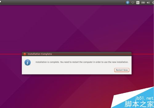 12、點擊”Restart Now“,重啟進入安裝好的Ubuntu桌面系統。輸入剛剛設置的密碼,登錄系統。