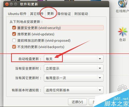 3、軟件和更新窗口可以更新系統,也可以更新軟件。點擊【更新】欄,設置成提示更新的方式為【每天】和有新版本時通知我設置為【適用任何新版本】,然后關掉軟件和更新窗口,之后系統如果在聯網就會提示你是否更新。