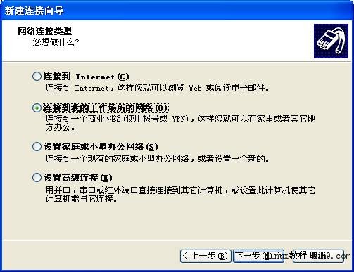 “網絡連接類型”選擇“連接到我的工作場所的網絡”,點擊“下一步”,如下圖