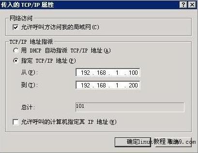 如果VPN服務器所在的網絡沒有開啟自動獲取IP地址(DHCP),則需要配置傳入連接的IP范圍,雙擊“Internet 協議(TCP/IP)”,在彈出的窗口中選擇“指定 TCP/IP 地址”,并填寫與VPN服務器同一網段的空閑地址,推薦為雙數。