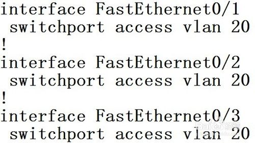 5、然后將這三個接口一起添加到VLAN 20中去,在接口模式下,輸入“no switchport access vlan 20“,如圖所示: