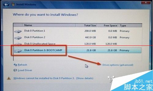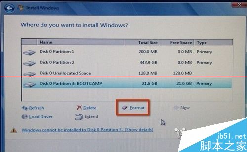 2、分區完之后根據Boot Camp助理提示,插入系統安裝光盤。系統識別光盤之后重啟。重啟后,自動進入windows安裝界面,之后和一般裝系統流程差不多。選中分出來的Boot Camp分區直接格式化,不要刪除。選擇NTFS格式,兼容性更好。格式化完之后直接安裝。