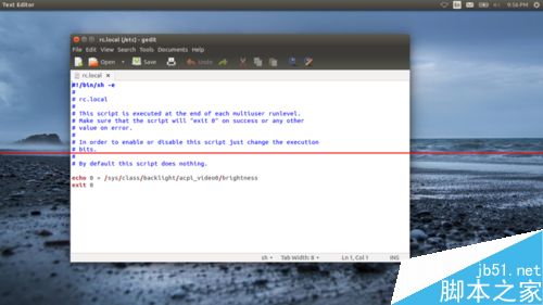 6、輸入密碼打開后,在exit 0之前插入一行:echo 0 > /sys/class/backlight/acpi_video0/brightness
