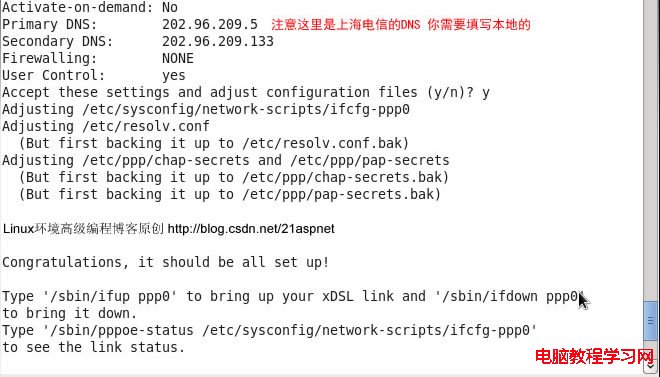 Welcome to the PPPoE client setup. First, I will run some checks onyour system to make sure the PPPoE client is installed properly...The following DSL config was found on your system:Device: Name:ppp0 DSLppp0Please enter the device if you want to configure the present DSL config(default ppp0) or enter n if you want to create a new one: ppp0LOGIN NAMEEnter your Login Name (default root): 中國電信或者網(wǎng)通給你的ADSL用戶名,注意電信給的有ad打頭INTERFACEEnter the Ethernet interface connected to the PPPoE modemFor Solaris, this is likely to be something like /dev/hme0.For Linux, it will be ethX, where X is a number.(default eth0): eth0← 指定網(wǎng)絡(luò)接入設(shè)備,一塊網(wǎng)卡的情況下,一般為默認(rèn)eth0Do you want the link to come up on demand, or stay up continuously?If you want it to come up on demand, enter the idle time in secondsafter which the link should be dropped. If you want the link tostay up permanently, enter no (two letters, lower-case.)NOTE: Demand-activated links do not interact well with dynamic IPaddresses. You may have some problems with demand-activated links.Enter the demand value (default no): ← 直接按回車,接受默認(rèn)設(shè)置,詢問的是,adsl連接以后,是否持續(xù)保持連接。或者是自動的斷開,在指定的時間(以秒數(shù)計算)內(nèi)。多數(shù)情況下,我們希望手動的打開關(guān)閉連接。所以這里選擇默認(rèn)的no。DNSPlease enter the IP address of your ISPs primary DNS server.If your ISP claims that the server will provide dynamic DNS addresses,enter server (all lower-case) here.If you just press enter, I will assume you know what you aredoing and not modify your DNS setup.Enter the DNS information here: 202.96.209.5 第一個DNS建議手動設(shè)置,不然可能連不上Please enter the IP address of your ISPs secondary DNS server.If you just press enter, I will assume there is only one DNS server.Enter the secondary DNS server address here: 202.96.209.133 第二個DNS建議手動設(shè)置,不然可能連不上PASSWORDPlease enter your Password: 輸入ADSL的連接密碼Please re-enter your Password: ← 再次確認(rèn)輸入ADSL的連接密碼USERCTRLPlease enter yes (three letters, lower-case.) if you want to allownormal user to start or stop DSL connection (default yes): yes← 填入no,不允許一般用戶控制PPPoE的連接FIREWALLINGPlease choose the firewall rules to use. Note that these rules arevery basic. You are strongly encouraged to use a more sophisticatedfirewall setup; however, these will provide basic security. If youare running any servers on your machine, you must choose NONE andset up firewalling yourself. Otherwise, the firewall rules will denyaccess to all standard servers like Web, e-mail, ftp, etc. If youare using SSH, the rules will block outgoing SSH connections whichallocate a privileged source port.The firewall choices are:0 - NONE: This script will not set any firewall rules. You are responsiblefor ensuring the security of your machine. You are STRONGLYrecommended to use some kind of firewall rules.1 - STANDALONE: Appropriate for a basic stand-alone web-surfing workstation2 - MASQUERADE: Appropriate for a machine acting as an Internet gatewayfor a LANChoose a type of firewall (0-2): 0← 輸入0,不在這里使用防火墻Start this connection at boot timeDo you want to start this connection at boot time?Please enter no or yes (default no):yes← 填入yes,在系統(tǒng)啟動時自動連接ADSL