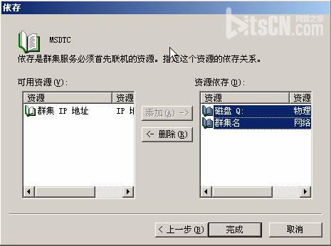 4. 選擇MSDTC 依存關系,資源包括磁盤Q( 仲裁盤) 和群集名