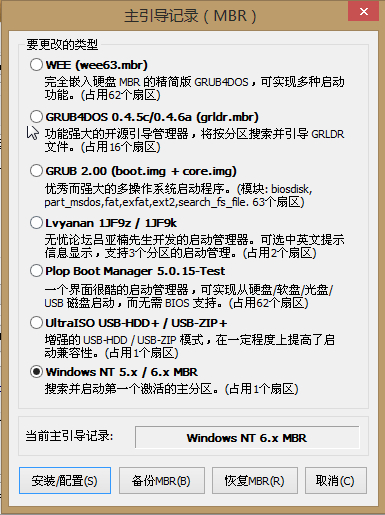 找到問題解決起來就容易了,使用winntsetup修改首塊硬盤的MBR,然后根據各引導工具的不同編輯其啟動項即可;使用了wee和grup4dos均可引導第二塊硬盤上的win7;但是引導工具的速度并沒有windows原始的理想,即使將timeout設為0,開機后會有1~2s黑屏時間;因此這里還是使用windows自己的引導,這里如下圖先選擇首塊硬盤作為安裝的目標磁盤,然后選擇windows nt點擊安裝即可。