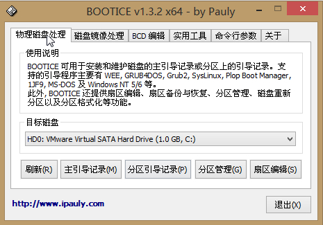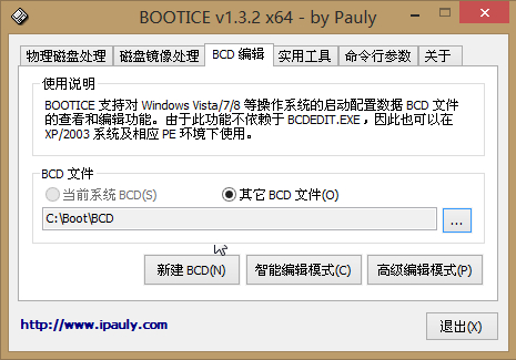 現在就要使用到這個分區了,為可以實施引導,引導分區中必須有bootmgr和BCD文件,因此我們把現有系統中的bootmgr文件和boot文件夾復制到上圖的C盤中;然后使用winntsetup編輯BCD文件以可以正常引導磁盤1上的系統;如下圖: