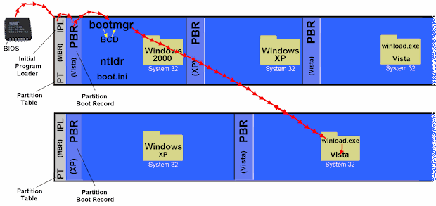 查找資料,發現多硬盤的情況下只能按下述方式啟動,即引導信息要寫在首塊硬盤的MBR上。