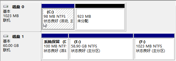 由于windows nt使用到激活的主分區,因此在首塊硬盤上分一個100M的分區供引導使用,分區后如下圖磁盤0所示: