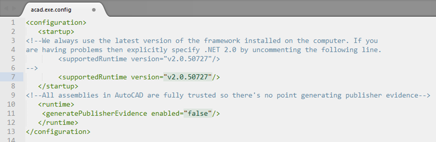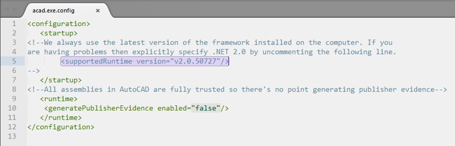 修改AutoCAD的配置文件,這個文件在AutoCAD的安裝目錄下。打開配置文件(acad.exe.config)如下: