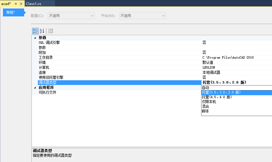 關于問題1,斷點不起作用的原因歸結為Visual Studio 2010不會選擇正確的版本的調試器,在調試時啟動了默認的debugger(v4.0),此調試器不會看到針對舊版本的.NET 項目中的斷點,但是為了讓我們的.NET應用程序能在AutoCAD 2010等上運行,我們需要.NET Framework 2.0( 3.5也是運行在CLR 2.0之上的)。