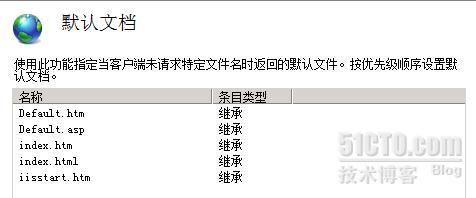 可以看到系統(tǒng)自帶有5種默認(rèn)文檔:Default.htm、Default.asp、Index.htm、Index.html、iisstar.htm,其優(yōu)先級依次從高到低。作為網(wǎng)站首頁的Web文件必須使用上述5個名字中的一種,如果是使用的其它名字,則必須將其添加到文檔列表中。