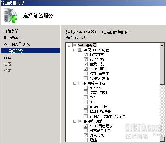 IIS 7.5被分割成了40多個不同功能的模塊,管理員可以根據(jù)需要定制安裝相應(yīng)的功能模塊,這樣可以使Web網(wǎng)站的受攻擊面減少,安全性和性能大大提高。所以,在“選擇角色服務(wù)”的步驟中我們采用默認(rèn)設(shè)置,只安裝最基本的功能模塊。