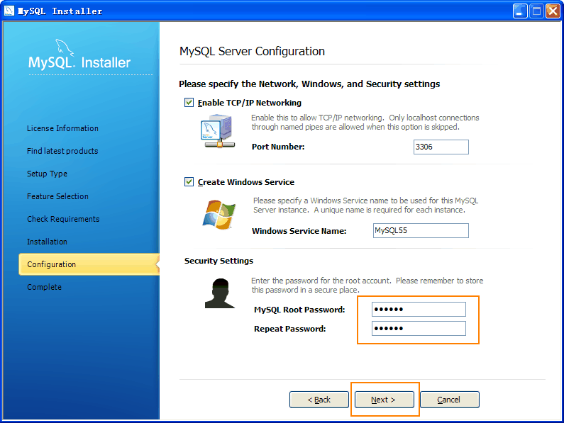 默認3306端口,默認MySQL55 Windows服務進程名稱。輸入密碼與重復密碼。選擇“Next”按鈕繼續(如圖16)。