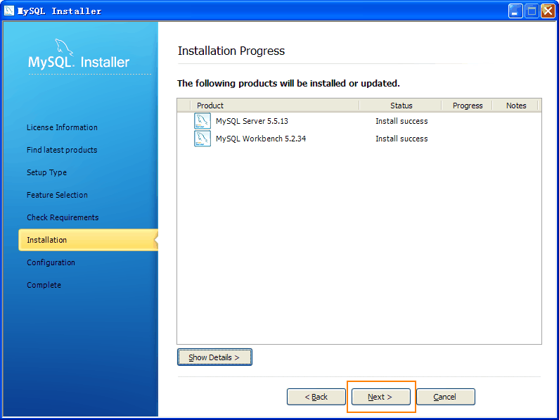 選擇“MySQL Server 5.5.13”與“MySQL Workbench 5.2.34”, “MySQL Workbench 5.2.34”是可視數據庫設計工具。這個工具是設計MySql數據庫的專用工具。也可根據需要選擇是否安裝。選擇“Next”按鈕繼續安裝(如圖 12)。