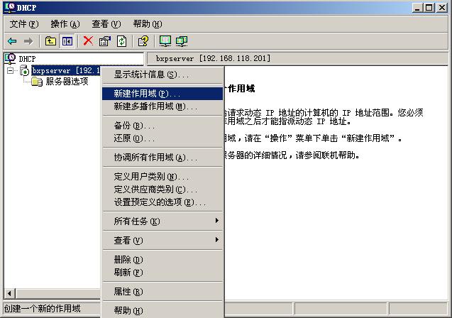 在"BXPSERVER[192.168.118.201]"上單擊右鍵選擇"新建作用域"(圖3),