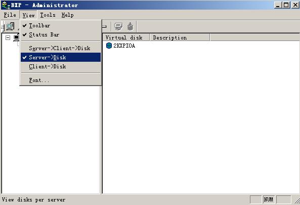 8、單擊“開始”菜單→程序→ Venturcom BXP→BXP Administrator打開BXP管理程序。將管理程序的面板模式改變為“Server”→“Disks”。 操作為:單擊“VIEw”菜單,選擇“Server”→“Disks”(圖14)。
