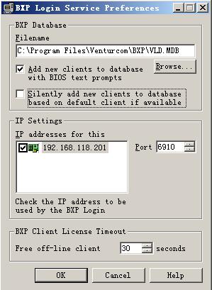在服務器上,單擊“開始”菜單→選擇“程序”→ Venturcom BXP→ BXP Login Service Preferences,出現“BXP Login Service Preferences” 對話框,檢查數據庫路徑是否正確定(默認情況下在C: Program FileVenturcomBXP VLD.MDB),在“IP Settings”列表中綁定“198.168.118.201”,其它的選項可以按默認值進行設置單擊“OK”按鈕,完成登錄服務的配置。(圖11)