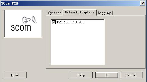 在服務器上,打開“控制面板”,雙擊“3 COM PXE”圖標。如果出現警告信息,說明 PXE服務還沒有啟動,單擊“是”按鈕,若已安裝Windows 2000 自帶的DHCP,系統將提示已安裝DHCP,將禁用BXP內置的DHCP,單擊“確定”,此時出現“3COM PXE”對話框。單擊“Network Adapters”標簽,在服務器IP地址列表中,選中要綁定的IP地址,本例為192.168.118.201,單擊“OK”按鈕,完成PXE服務器設置(圖8)