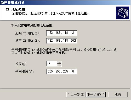 點下一步,起始IP和結束IP根據你的需要填寫(這個是工作站的IP范圍),例如,起始IP:192.168.118.2結束IP:192.168.118.200,子網掩碼填:255.255.255.0,(圖5)。