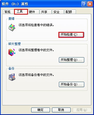 通常這個提示是由于系統檢測到硬盤錯誤而啟動硬盤自檢程序的信息。產生這個問題多數是由于非正常斷電等因素,造成硬盤的磁頭沒有時間執行關機程序并歸位造成的。大家首先可以重新驅動下電腦,看看能否解決,如果依舊還有這個提示,則那么需要檢查對應磁盤中的錯誤。如上面提示是D盤有問題,因此可以進入“我的電腦”在D盤上右鍵,選擇“屬性”,然后再切換都“工具”選項,最后在點擊“開始檢查”并勾選“自動修復文件系統錯誤”然后開始檢查即可,一般都可以解決問題,如下圖: