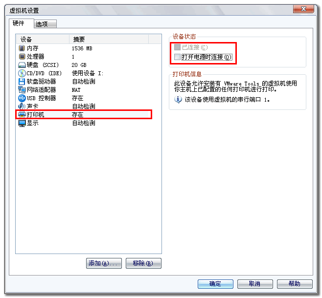 這是因為vm7.01默認是開啟打印機. 那么只要把虛擬機的打印設備關掉就可以了.