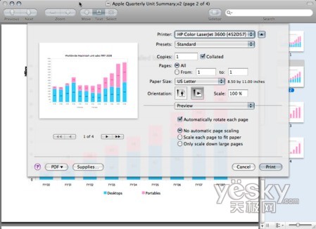 對于像我這樣經常使用復制機的家伙來說,我在過去的幾年里,花了不少時間來思考與打印對話框有關的東西。其中有一樣東西一直讓我感到困惑:為什么我要打印出來的Word或者Excel文件,微軟就給那么小一個預覽呢?我還得在標準預覽對話框中再點一下預覽按鈕?我不希望要啟動“預覽”才能看見預覽,尤其因為這并不是真正的預覽。我想要它就在“打印”對話框中。不過Leopard在每次我需要打印時,都會給出一個漂亮的大預覽圖,我無需再抱怨。