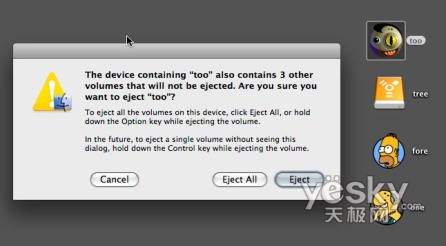 在卸載分區方面,Leopard同樣也更加聰明和智能化。在過去,如果你想把臺式電腦里已經過分區的硬盤中的某個卷卸載的話,Mac OS X會假定你想卸載那塊硬盤上的所有分區。現在有了Leopard,你有了更多選項,是只卸載選定的卷,或者你也可以選定整塊磁盤。而且,如果在卸載分區時,你一直按著Control鍵,它就會只卸載選定的分區,且不會彈出確認對話框。