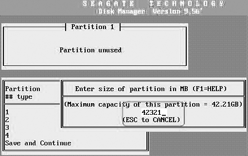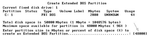 在圖7界面中輸入擴展分區的大小,這里一般將主分區外的所有剩余空間都分配給擴展分區,比如本例中的48000MB?;剀嚧_認后出現主分區和擴展分區的容量分配比例界面。然后按“Esc”鍵,出現如圖8所示界面。