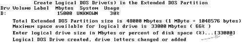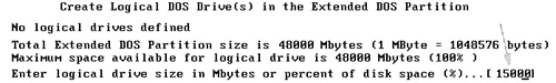 提示:在本例中,總共50000MB的磁盤,主分區分了2000MB,擴展分區48000MB,第一個邏輯分區15000MB,第二個邏輯分區33000MB,如果第二個邏輯分區沒有分配完剩余的擴展分區空間的話,還會反復出現圖9的界面,直到擴展分區空間被分完為止。