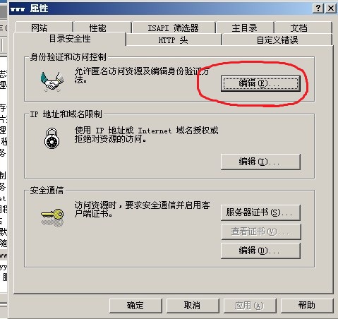 6.接下來,我們把剛建的帳號,應用到網站里, 打開IIS管理器,選擇我們已經建的網站,屬性-目錄安全性-編輯身份驗證和訪問控制".