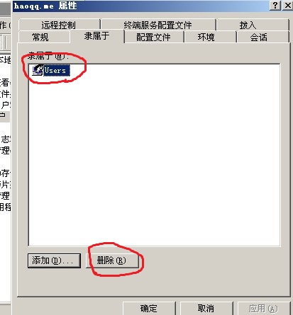 5.新建 的用戶,默認有Users權限,這個權限有點大。我們把它的這權限刪掉,應用,確定。這樣一個低權限的帳號建好呢