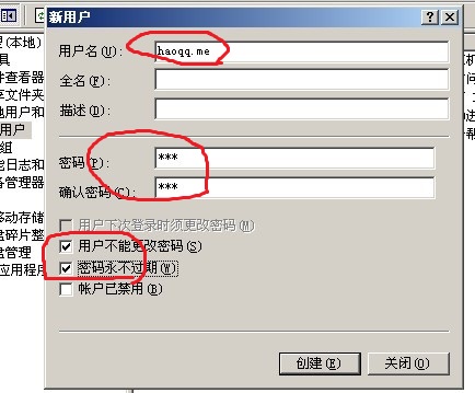 3.新建用戶,用戶名、密碼、隨便寫,這些你得住,待會用得上的。用戶不能更改密碼和密碼永不過期(勾上)