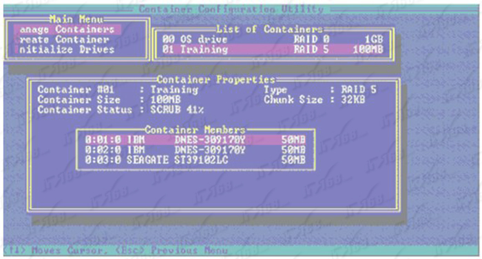 第8步,單擊回車后返回到如(圖6)所示主菜單配置界面,選中“Manage containers”選項,單擊回車后即彈出當前的容器配置狀態(tài),如(圖10)所示。選中相應的容器,檢查這個容器的“Container Status”選項中的“Scrub”進程百分比。當它變?yōu)?ldquo;Ok”后,這個新創(chuàng)建的Container便具有了冗余功能。