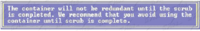 第7步,這是系統(tǒng)會出現(xiàn)如(圖9)所示提示,提示告訴用戶當所創(chuàng)建的容器沒有被成功完成“Scrub(清除)”之前,這個容器是沒有冗余功能的。