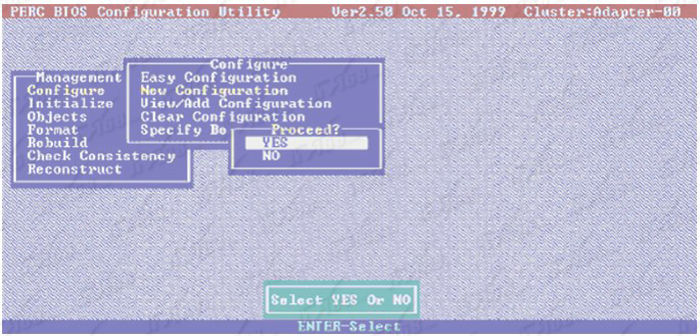 第3步,如果需要重新配置一個RAID,請選中“New Configuration”;如果已經(jīng)存在一個可以使用的邏輯磁盤,請選中“View/Add Configuration”,并按回車鍵。在此,我們以新建磁盤陣列為例進行介紹。選擇“New Configuration”選項。按回車鍵后,彈出一個小對話框,如(圖15)所示。