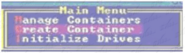 第5步,按“Y”鍵確認即可,進入如(圖6)所示配置主菜單(Main Menu)界面。硬盤初始化后就可以根據(jù)您的需要,創(chuàng)建相應陣列級別(RAID1,RAID0等)的容器了。這里我們以RAID5為例進行說明。在主菜單界面中選擇“Create container”選項。