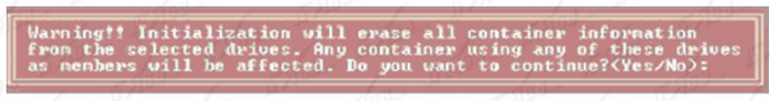 第4步,全部選擇完成所需加入陣列的磁盤后,按加車鍵,系統(tǒng)鍵彈出如(圖5)所示警告提示框。提示框中提示進行初始化操作將全部刪除所選硬盤中的數(shù)據(jù),并中斷所有正在使用這些硬盤的用戶。