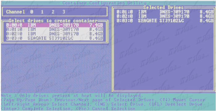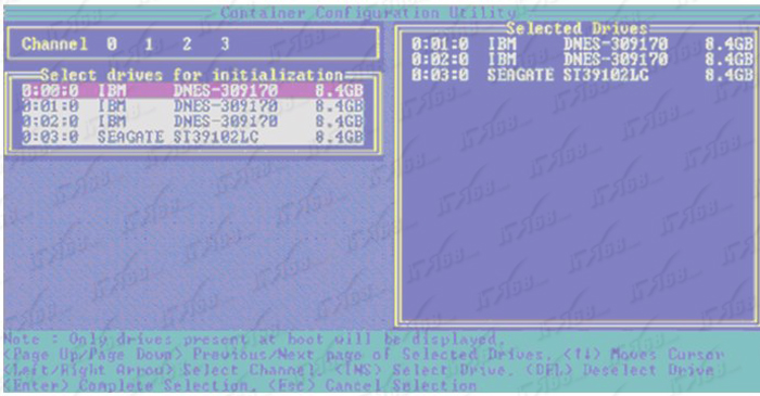 第3步,選擇“Initialize Drivers“選項去對新的或是需要重新創(chuàng)建容器的硬盤進行初始化(注意: 初始話硬盤將刪去當前硬盤上的所有數(shù)據(jù)),按回車后進入如(圖4)所示界面。在這個界面中出現(xiàn)了RAID卡的通道和連接到該通道上的硬盤,使用 “Insert”鍵選中需要被初始化的硬盤(具體的使用方法參見界面底部的提示,下同)。