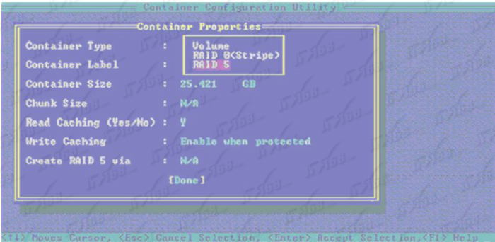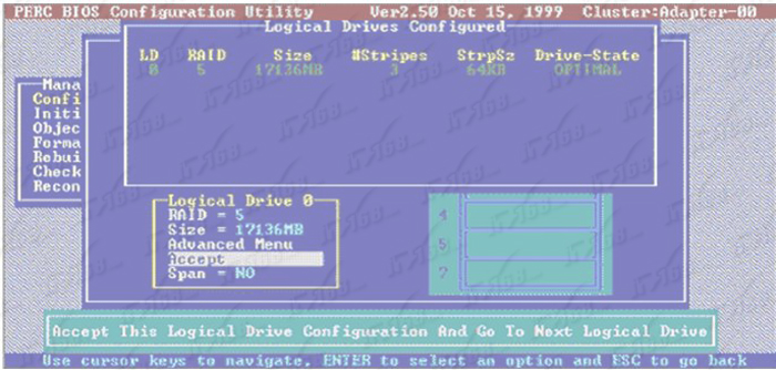 第7步,按“F10”鍵配置邏輯磁盤。選擇合適的RAID類型,其余接受默認值。選中“Accept”,并按回車鍵確認,即彈出如(圖18)所示的最終配置信息提示框。