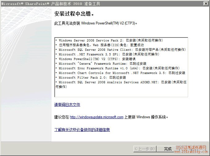 安裝出錯了,錯誤提示無法安裝PowerShell CTP3,我單獨下載了這個安裝包,安裝也出錯,最后通過測試,發現,需要先把Windows Server 2008自己帶的PowerShell 1.0 卸載之后,才可以安裝;卸載之后,安裝成功了。