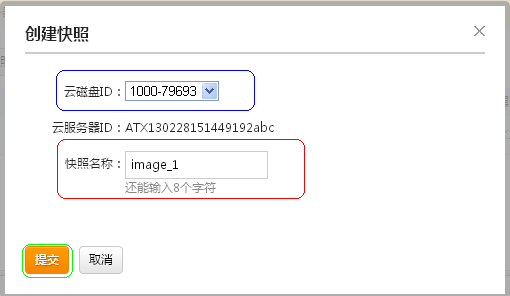 選擇藍框線所示的云磁盤ID下拉菜單,選擇需要創(chuàng)建快照的云磁盤。然后如紅框線所示,輸入快照名稱,點擊綠框線內(nèi)的“確定”。等待快照創(chuàng)建完畢。