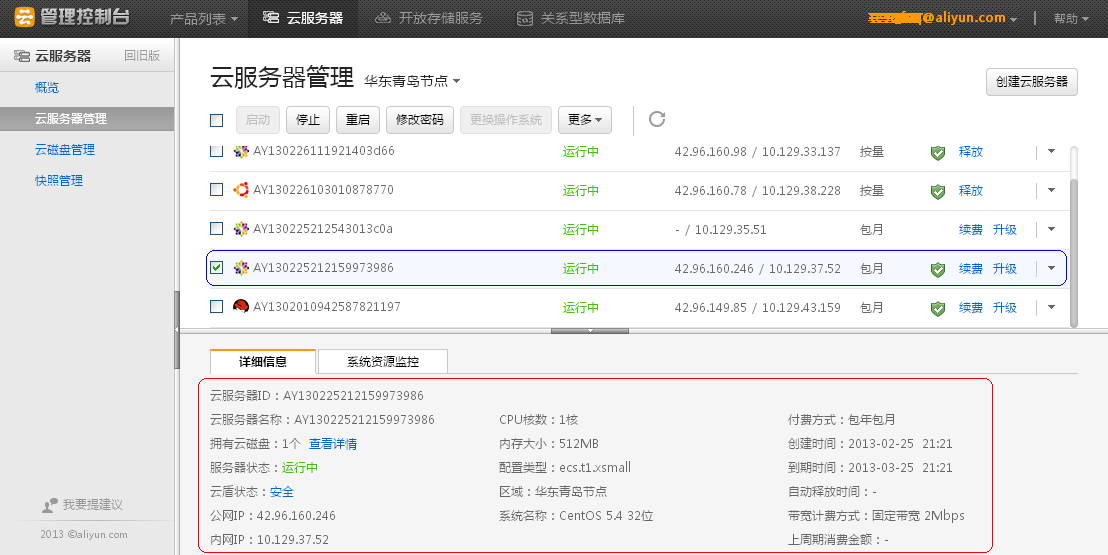 點擊云服務(wù)器列表中的一個云服務(wù)器項(除復(fù)選框部分),見藍色框線部分,可以選中一臺云服務(wù)器。 選中后紅色框線部分自動展示這臺云服務(wù)器的詳細信息。