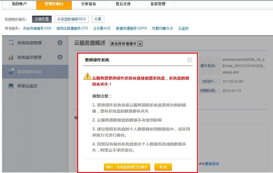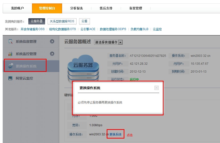 2.點擊更換操作系統-更換系統,操作之前請您先“停止”云服務器