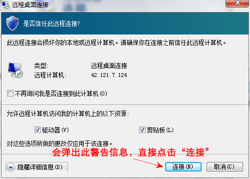 連接并且不向我發出警告:使用此選項,即使遠程桌面連接無法驗證遠程計算機的身份,它仍然會連接。