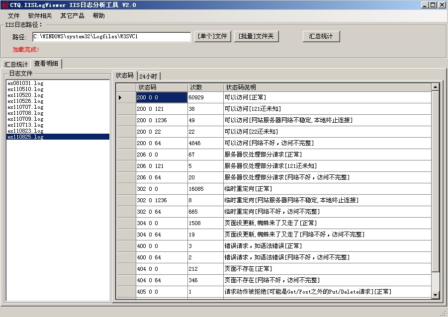 4:切換“查看明細”,可以選擇日志文件可以針對單個IIS日志文件進行分析,這里示例按狀態碼進行分析,右側顯示日志的狀態碼統計,并有針對狀態碼的基本說明,如下圖: