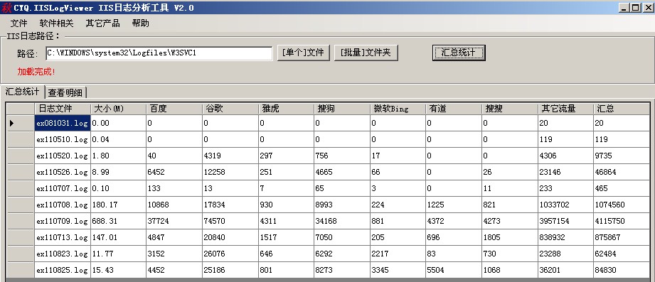 3-1:“匯總統計”加載完成后,將顯示出所有文件各搜索引擎和非搜索引擎的基本訪問信息,如下圖: