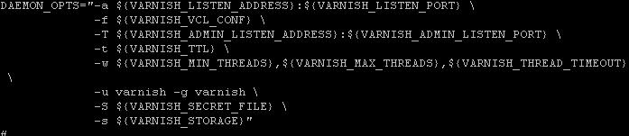 二、配置文件1、配置Varnish 啟動運行參數,如指定對應執行腳本,即vcl文件Varnish管理端口,默認為6082,可以改為自己定義的端口,如2000VARNISH_ADMIN_LISTEN_PORT=2000監聽端口,默認為8080,一般改為80VARNISH_LISTEN_PORT=80指定緩存文件存放路徑VARNISH_STORAGE_FILE=/var/lib/varnish/varnish_storage.bin緩存文件varnish_storage.bin在32位操作系統下,最大僅能支持2G,如果需要更大緩存文件則需要安裝64為Linux操作系統